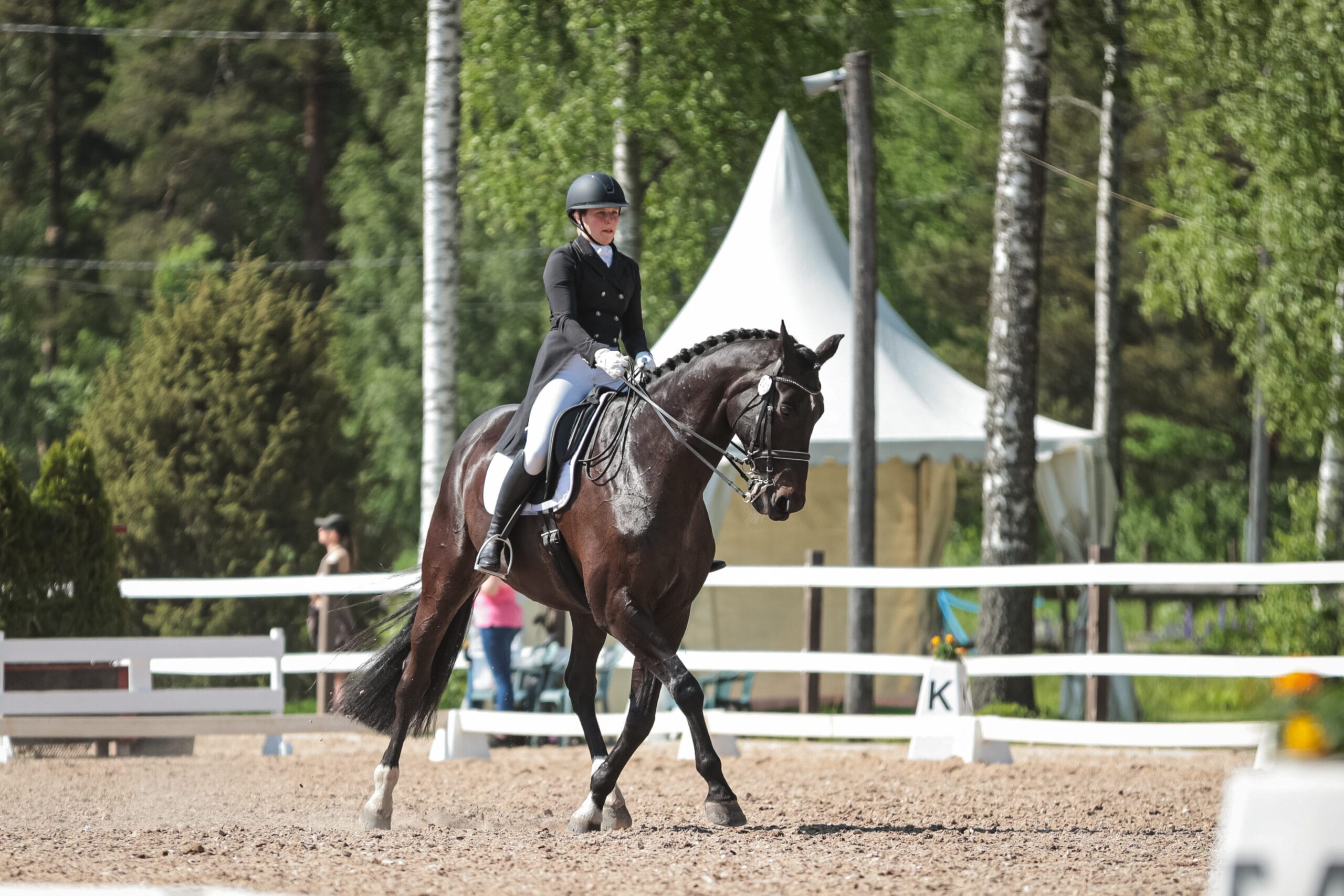 ”Vähän oli sellainen raskas rata, olisin voinut tänään valmistella hevosen paremmin ja saada kokoamisastetta paremmaksi. Minun hevoseni on kyllä ihana ja suorittaa, vaikka ratsastaja ei aina ihan ole kartalla. Se on kyllä huippu tyyppi”, kuvailee Kallio suoritustaan aurinkoisessa ja lämpimässä kesäsäässä.