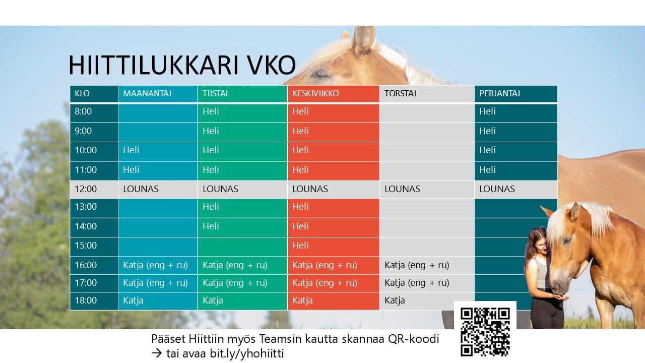 Opintoja ohjaavat oma vastuuopettaja sekä muut opettajat. Tarvittaessa ohjaukseen osallistuvat myös opinto-ohjaaja ja ammatillinen erityisopettaja. Hevosopistolla järjestetään arkipäivisin opetuksen lisäksi tukea kirjallisiin tehtäviin Hiitissä. Näiden lisäksi järjestetään Hevosopiston talleissa pidettäviä talliklinikoita. Tukitoimet ovat kaikille opiskelijoillemme avoimia ja etukäteen ilmoittautuminen koskee vain talliklinikoita. Tukitoimiin voi osallistua silloin, kun omassa lukujärjestyksessä ei ole muuta ohjelmaa. Opetuksen aikana tukitoimiin osallistumisesta on aina sovittava etukäteen opettajan kanssa. Tule rohkeasti hakemaan vauhtia ja vahvistusta opintoihisi ja osallistu Hiitille! Viikoittainen Hiittilukkari näkyvissä alempana.