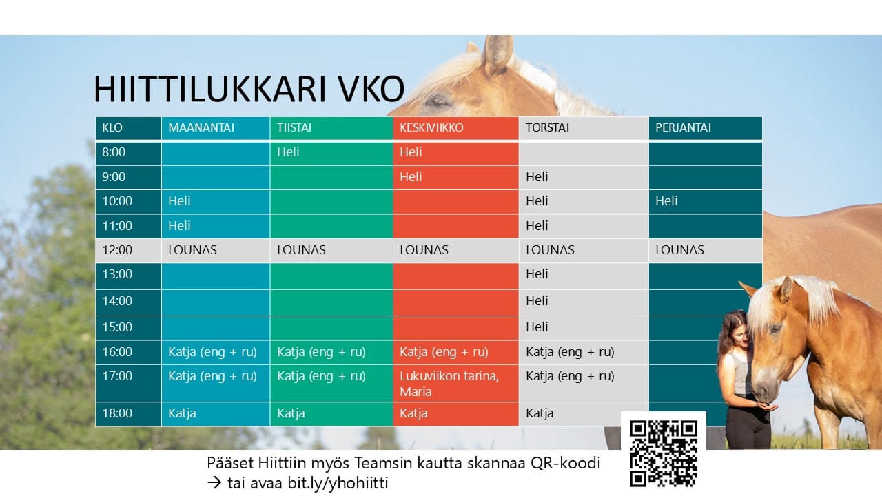 Opintoja ohjaavat oma vastuuopettaja sekä muut opettajat. Tarvittaessa ohjaukseen osallistuvat myös opinto-ohjaaja ja ammatillinen erityisopettaja. Hevosopistolla järjestetään arkipäivisin opetuksen lisäksi tukea kirjallisiin tehtäviin Hiitissä. Näiden lisäksi järjestetään Hevosopiston talleissa pidettäviä talliklinikoita. Tukitoimet ovat kaikille opiskelijoillemme avoimia ja etukäteen ilmoittautuminen koskee vain talliklinikoita. Tukitoimiin voi osallistua silloin, kun omassa lukujärjestyksessä ei ole muuta ohjelmaa. Opetuksen aikana tukitoimiin osallistumisesta on aina sovittava etukäteen opettajan kanssa. Tule rohkeasti hakemaan vauhtia ja vahvistusta opintoihisi ja osallistu Hiitille! Viikoittainen Hiittilukkari näkyvissä alempana.